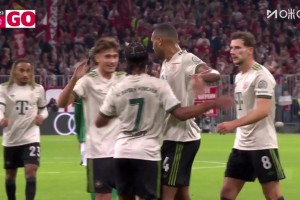 拜仁1-0领先!奥利塞右路传中,塔脚后跟打门折射入网!